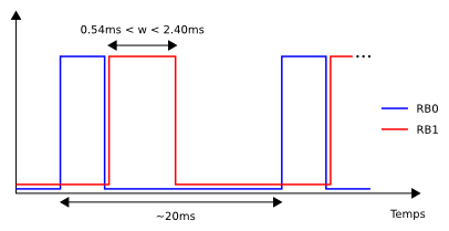 Cette librairie utilise donc les interruptions sur le Timer0 pour commander jusqu'à 8 servos connectés sur le port B. Nous allons Envoyer les pulsations pour chaque servo à la suite, puis attendre 20ms avant de recommencer. Sur le schéma suivant vous voyez bien que le délai entre deux pulsations sur RB0 va varier en fonction de ce qu'on envoie à RB1, mais c'est négligeable.